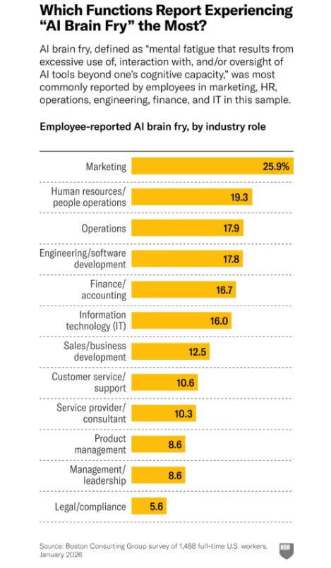 In one large study of nearly 1,500 workers across industries, roles, and levels, those performing high levels of AI oversight expended 14% more mental effort, experienced 12% more mental fatigue, and reported 19% higher information overload.